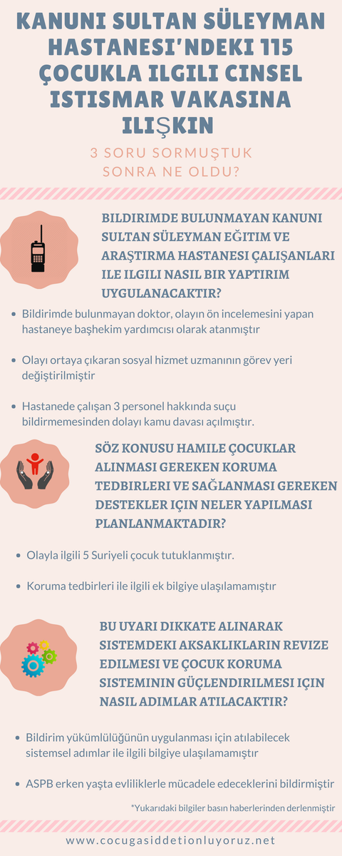 Bu amaçla ÇOCUĞA KARŞI ŞİDDETİ ÖNLEMEK İÇİN ULUSAL EYLEM PLANI’nın yürürlüğe girmesine ihtiyaç duyulmaktadır. Kanuni Sultan Süleyman Eğitim ve Araştırma Hastanesi’ne gelen hamile çocukların bildirilmemesi, çocukların şiddetten korunma haklarının açık bir ihlalidir. Tüm bu nedenlerle şu soruların cevaplarına ivedilikle ihtiyaç duyulmaktadır: